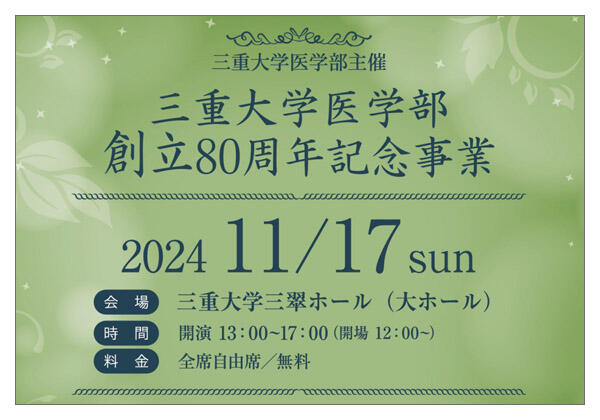 2024年11月17日(日)三重大学医学部80周年記念事業が開催されます。当日は式典と特別講演が開催され、特別講演におきましては、本学医学部を卒業しご活躍されている3名の先生方をお招きいたします。